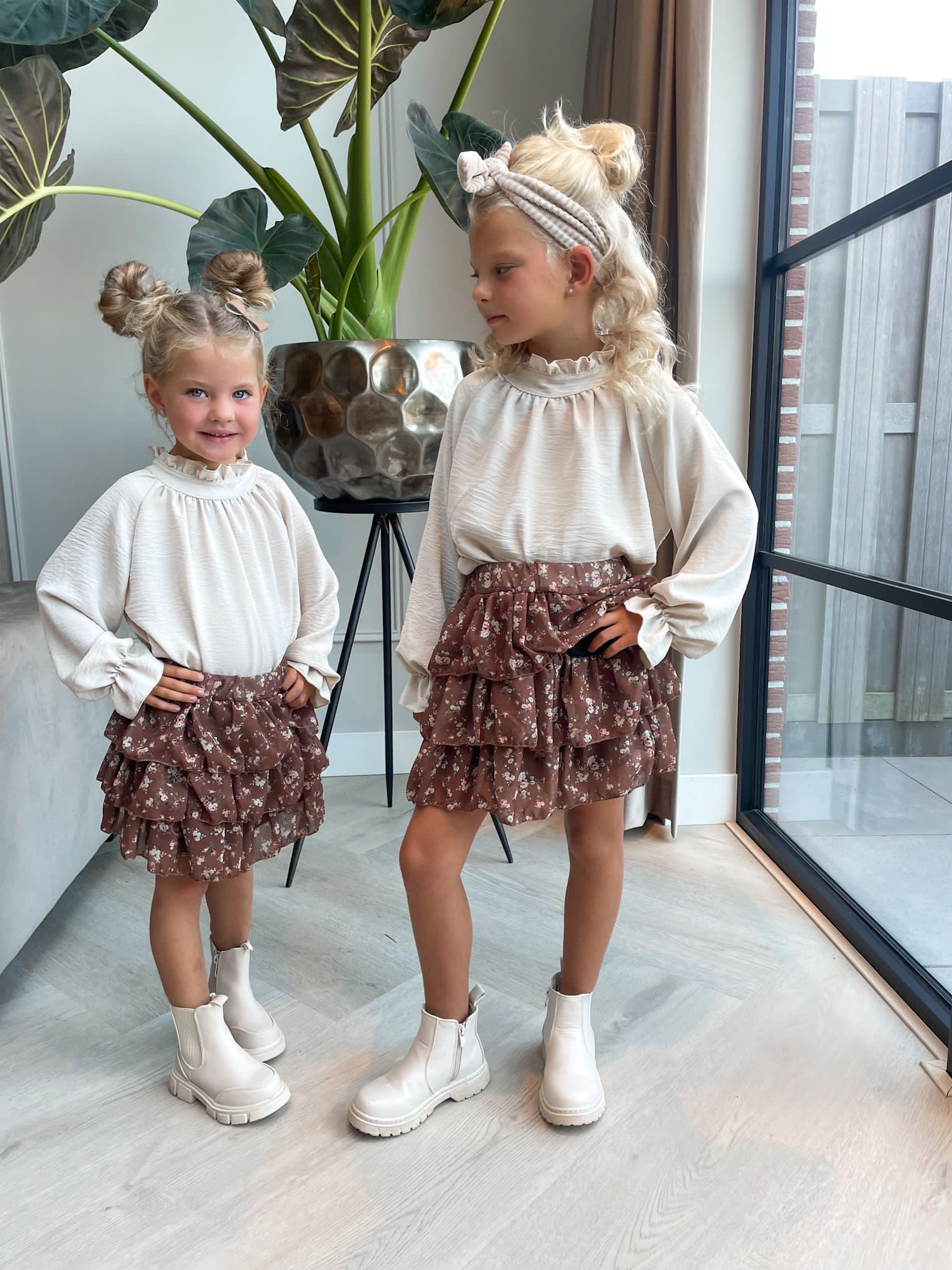 Lou draagt een 98/104 bij 99 cm en Lois een 122/128 bij 1.21 cm.